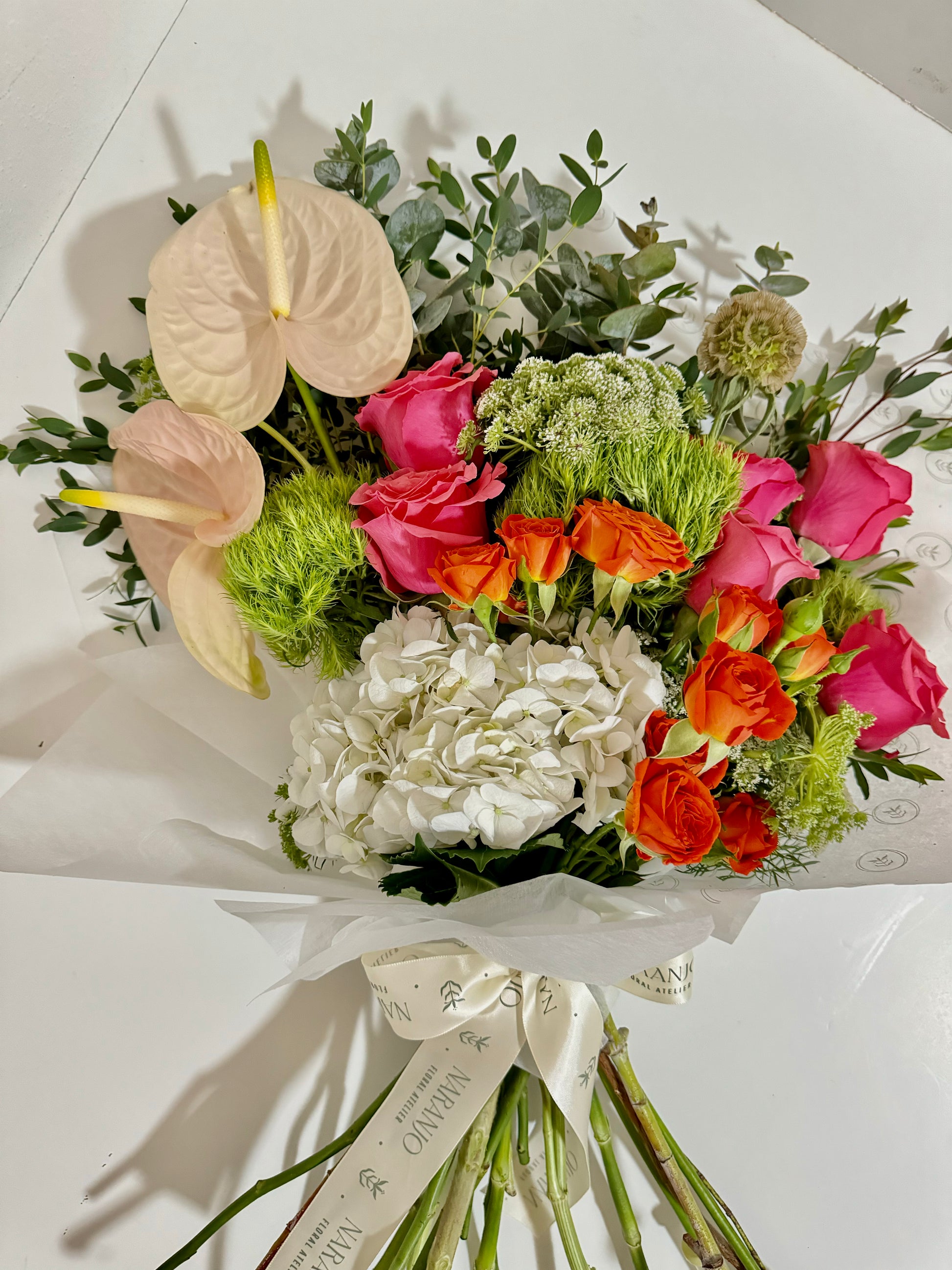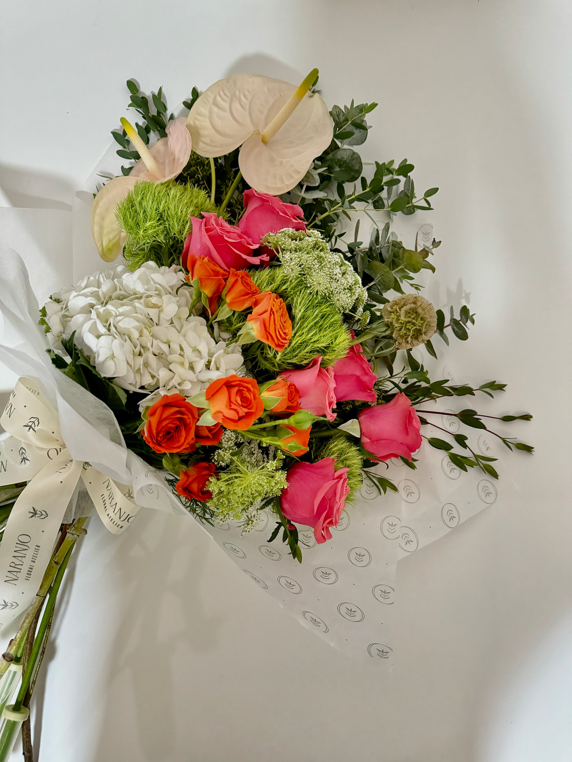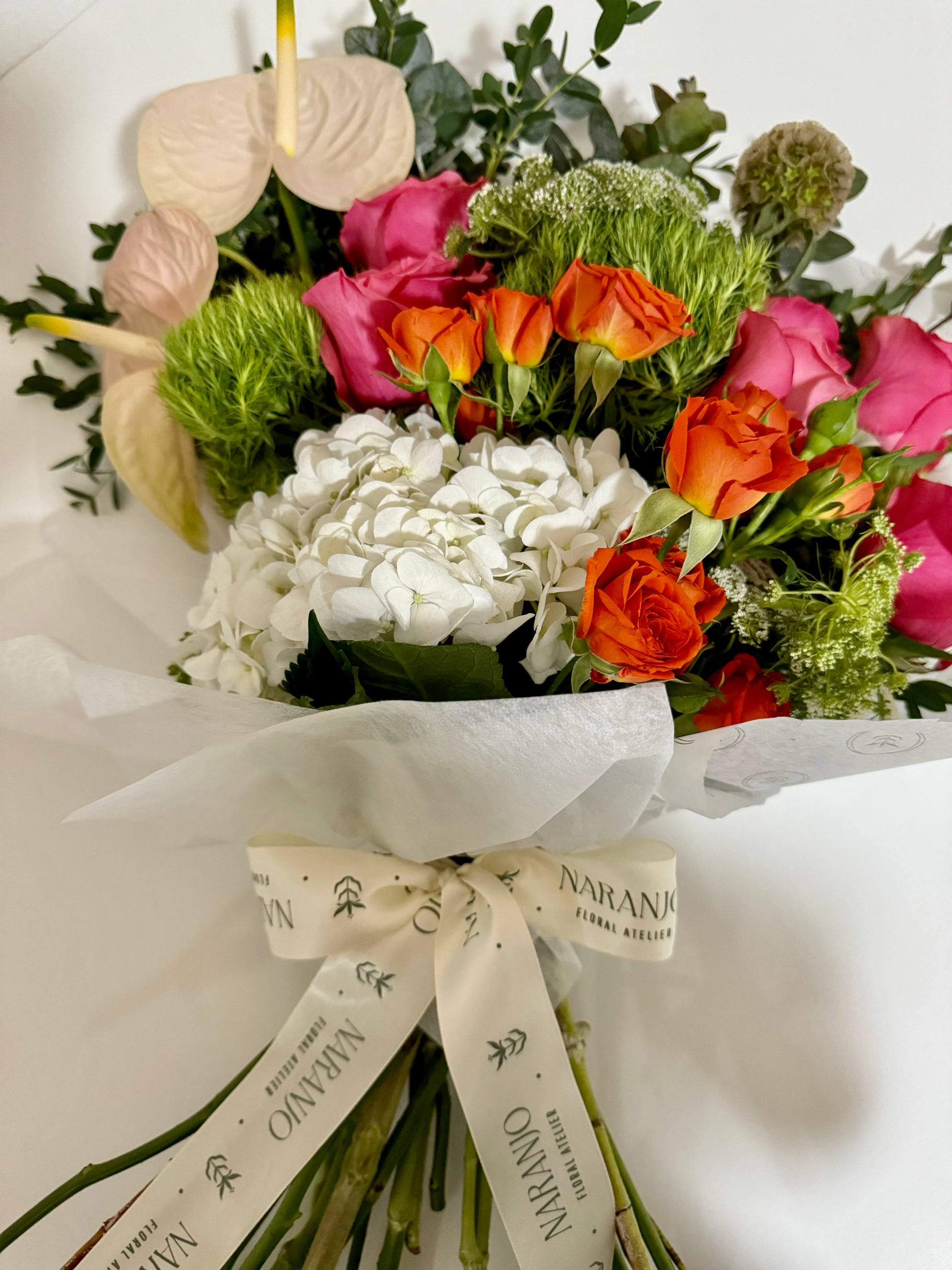 Cada obra es única y hecha a la medida. Por lo tanto, los tonos y tipo de flor pueden variar dependiendo de la disponibilidad y la temporada.